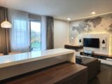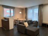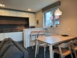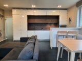 Prostorný obývací pokoj s kuchyňský koutem 27,96 m2 je vybaven linkou s vestavnými spotřebiči zn. Whirpool – indukční deska, el. trouba, digestoř, mikrovlnná trouba, lednice s mrazákem a myčka. Dále je zde jídelní stůl, židle, sedací souprava a obývací stěna. Z obývacího pokoje je vstup na balkon, který nabízí hezký výhled do okolí a zajištuje soukromí.