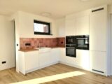 • Moderní kuchyňská linka v bílém lesku, černé úchyty a deska v barvě dubu. Vestavné spotřebiče značky BOSCH – myčka, indukční deska, trouba a lednice s mrazákem.